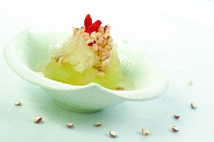 6. Garnish jelly with sliced snow fungus, steamed Gordon Euryale seeds, coix seeds and dried longan fruits. Serve.