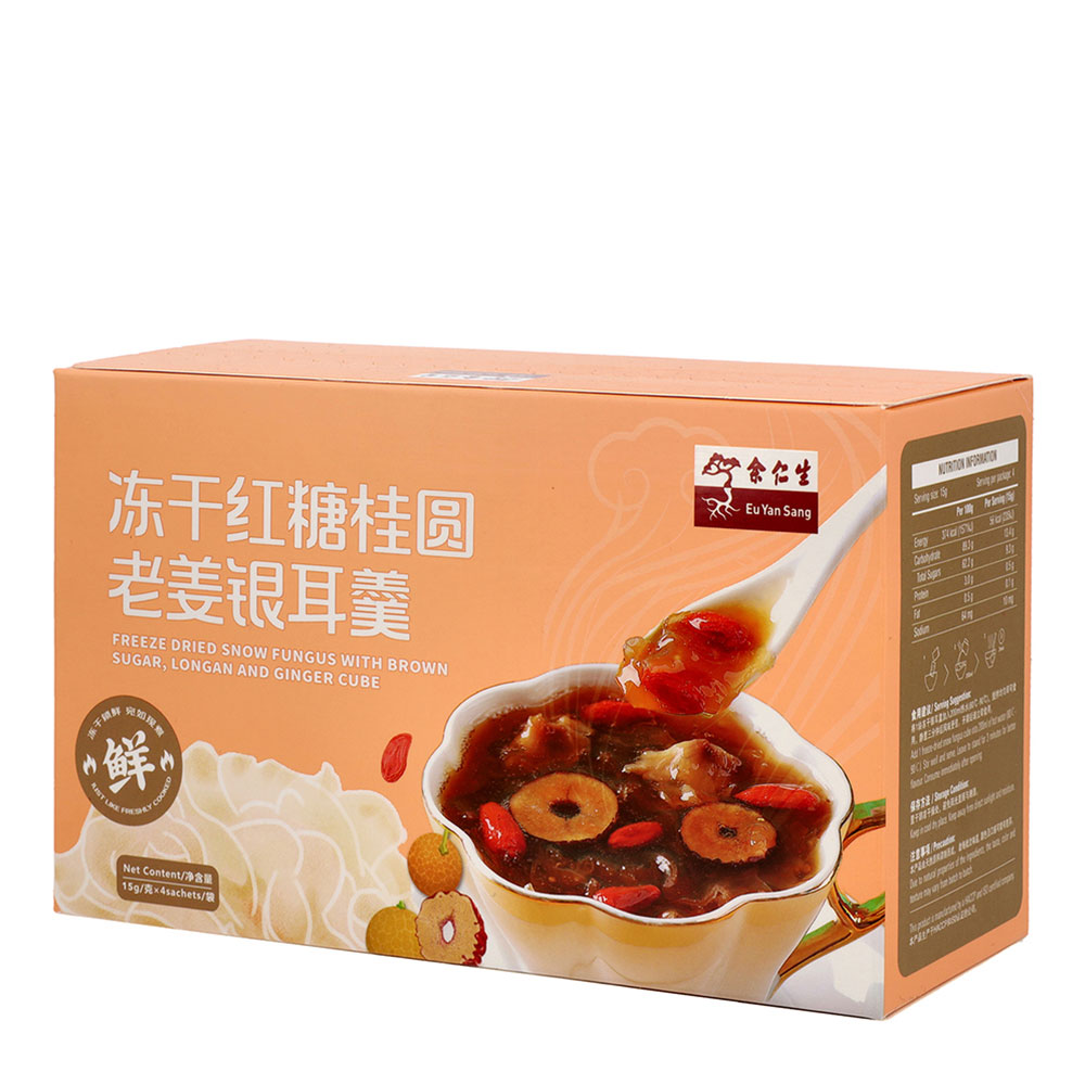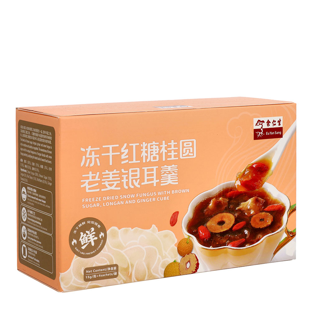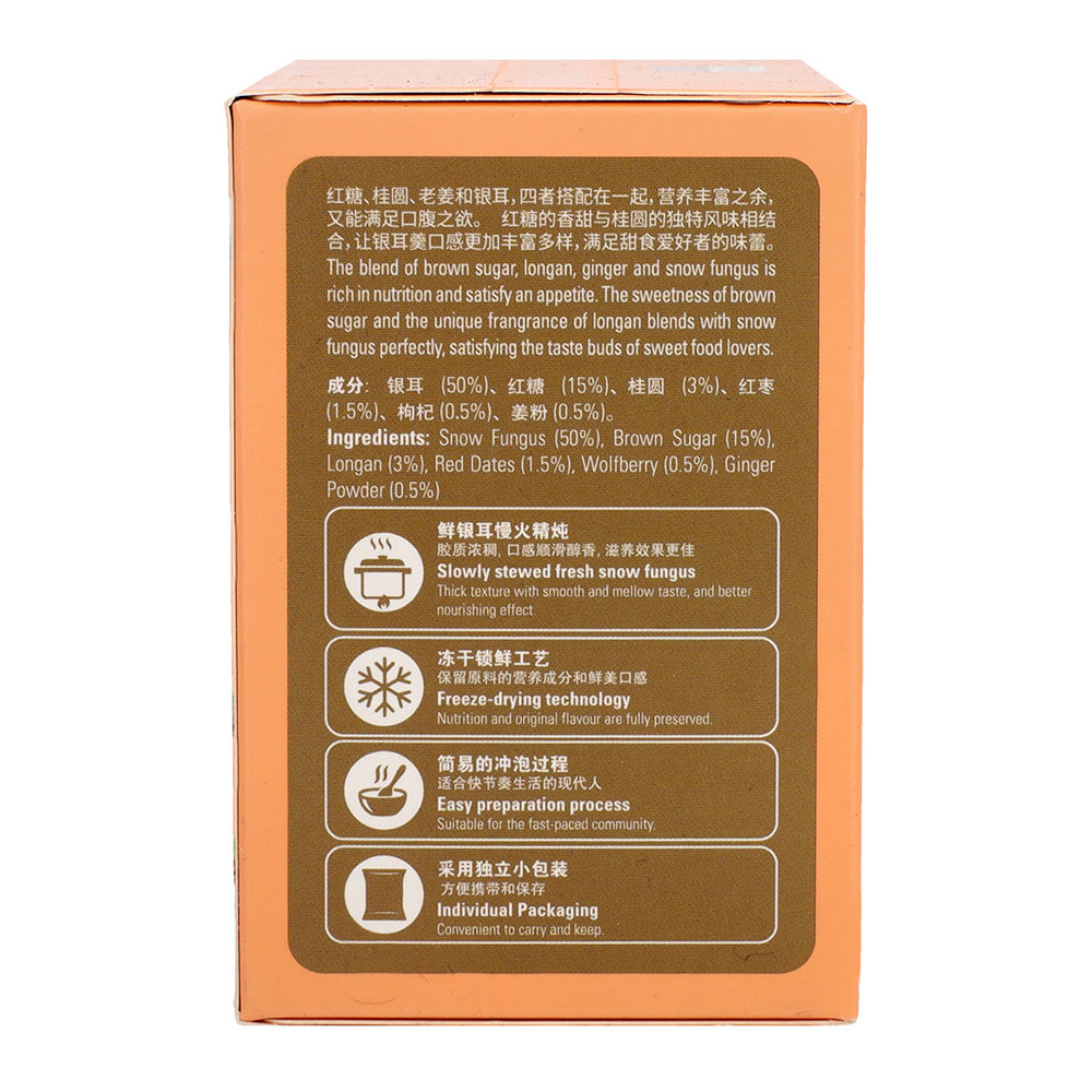 The blend of brown sugar, longan, ginger and snow fungus is rich in nutrition and satisfy an appetite. The sweetness of brown sugar and the unique fragrance of longan blends with snow fungus perfectly, satisfying the taste buds of sweet food lovers.