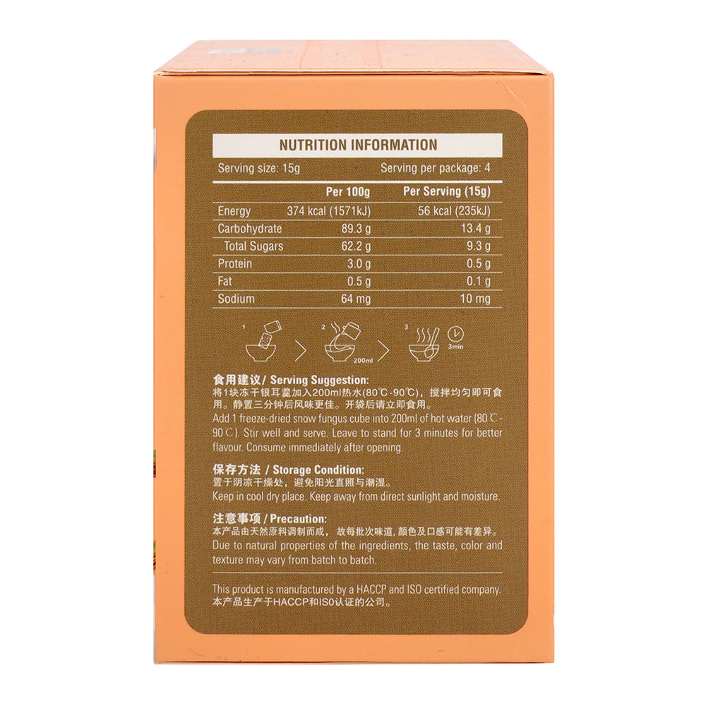 Serving Suggestion: Add 1 freeze-dried snow fungus cube into 200ml of hot water (80°C - 90°C). Stir well and serve. Leave to stand for 3 minutes for better flavour. Consume immediately after opening.