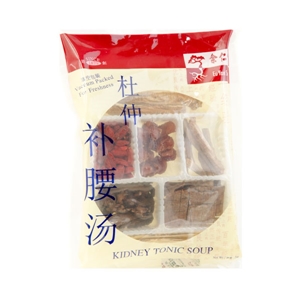 Kidney Tonic Soup 杜仲补腰汤: Radix Codonopsis, Fructus Lycii, Arillus Longan, Radix Achyranthis Bidentatae, Radix Morindae Officinalis, Cortex Eucommiae, Radix Astragali 党参,枸杞子,龙眼肉,牛膝,巴戟天,杜仲,黄芪 (1 pack / 包)