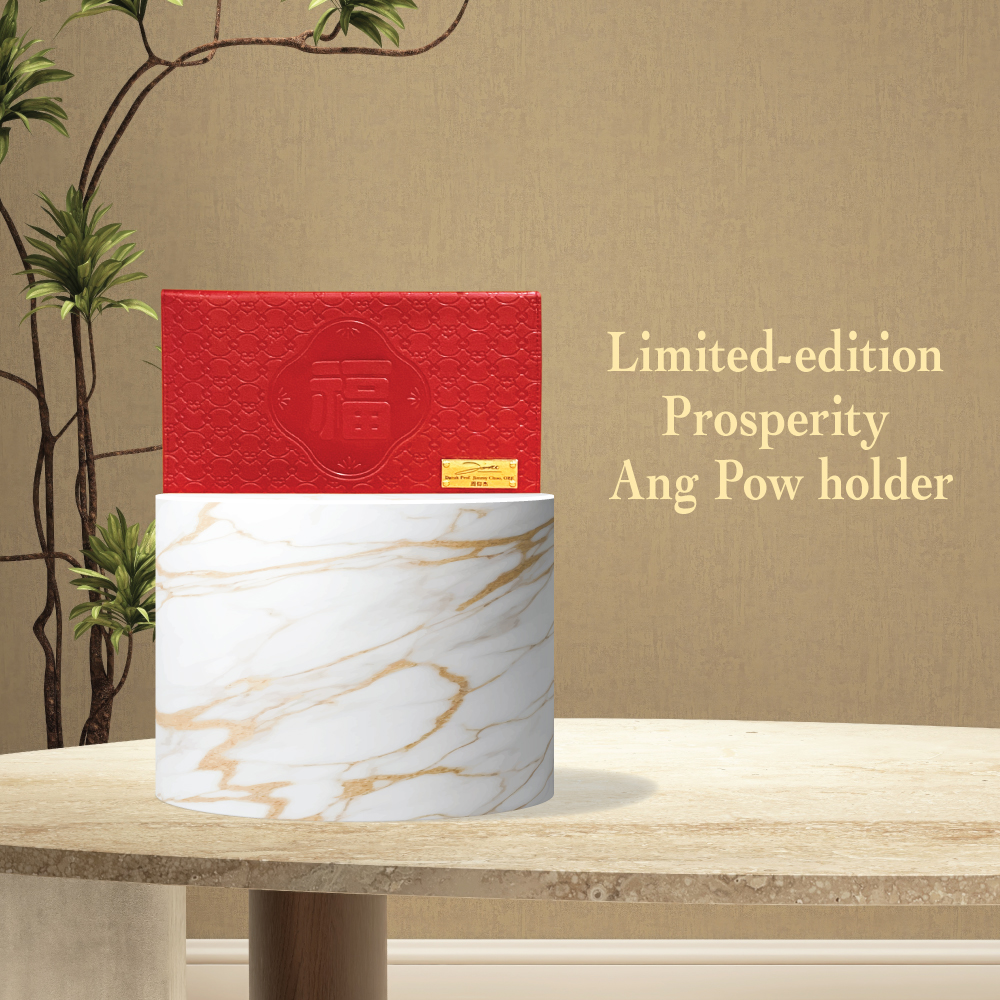 This precious treasure chest set also comes with a matching limited-edition Ang Bao pouch by Datuk Professor Jimmy Choo.